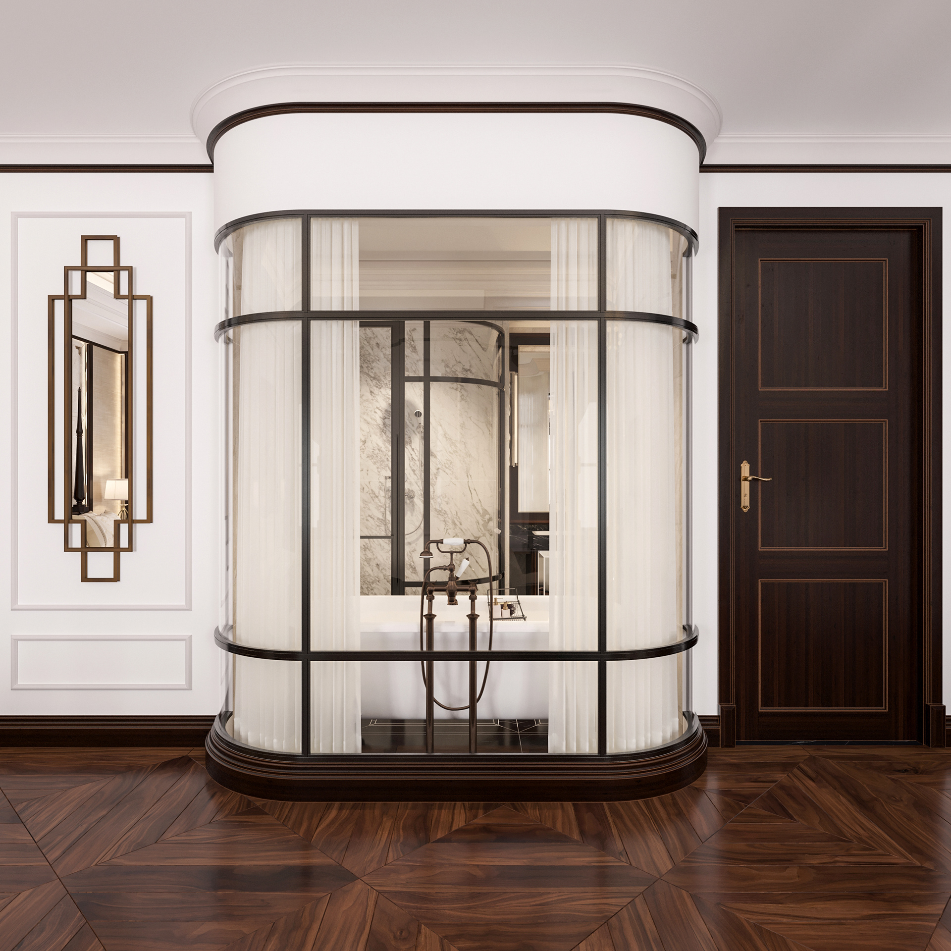 Bathtub has a connection to bedroom through the curved glass partition. The arrangement of glass mullions is similar to the strips binding rice cakes cover.