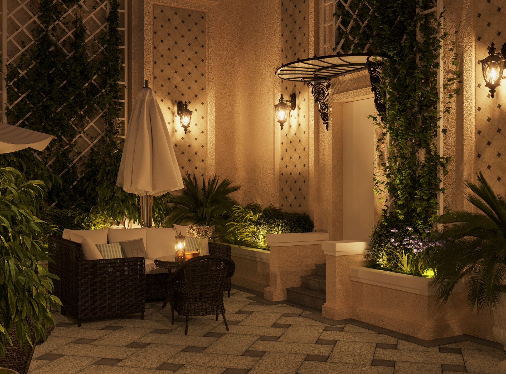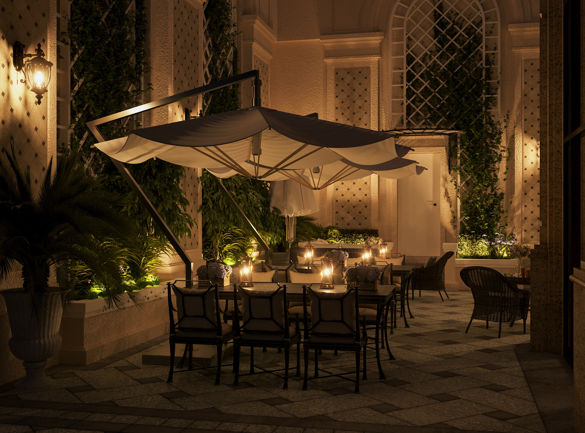 Night scene is illuminated by warm glow of lamps and candles. The faint scent of flowers combined with soothing music, creates a romantic and unforgettable evening.