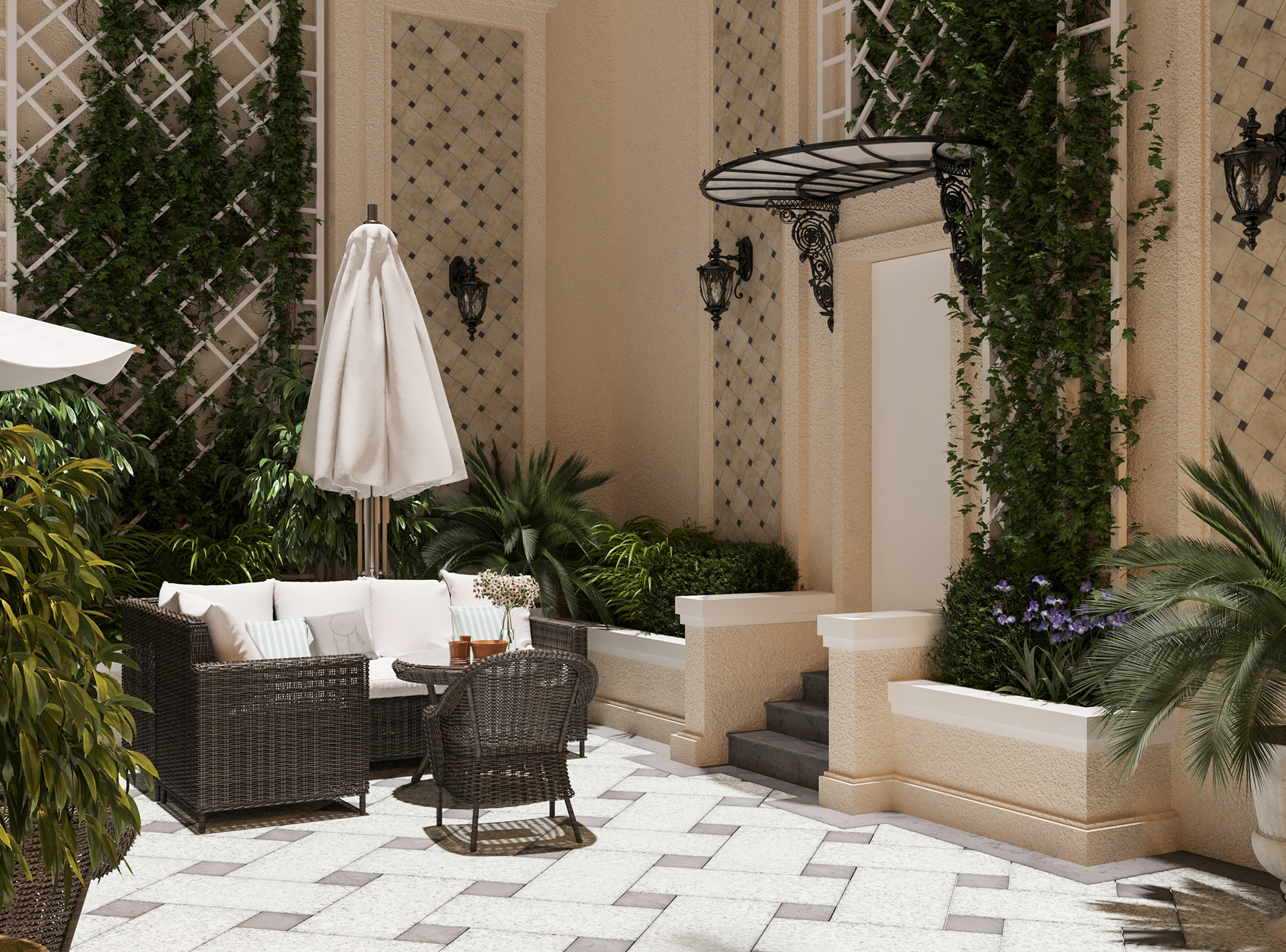 A corner of the garden unfolds, revealing a classic, romantic beauty. Here, you can relax and savor the fresh air of nature. A small table and comfortable seats are placed side by side, creating an ideal space for reading a book or enjoying a peaceful morning with a steaming cup of coffee.
